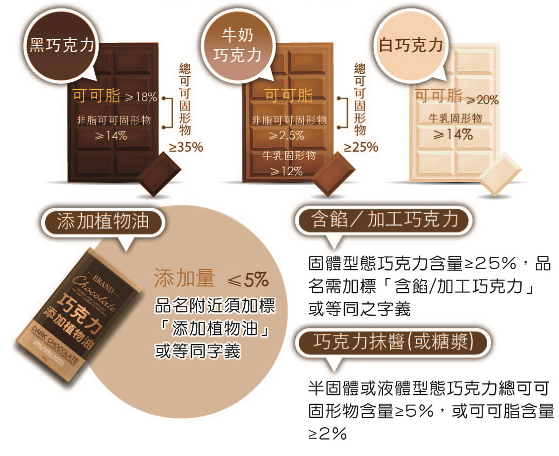 以可可製品為原料,添加糖、乳製品或食品添加物等製成之 「固體型態」「不含內餡」的巧克力