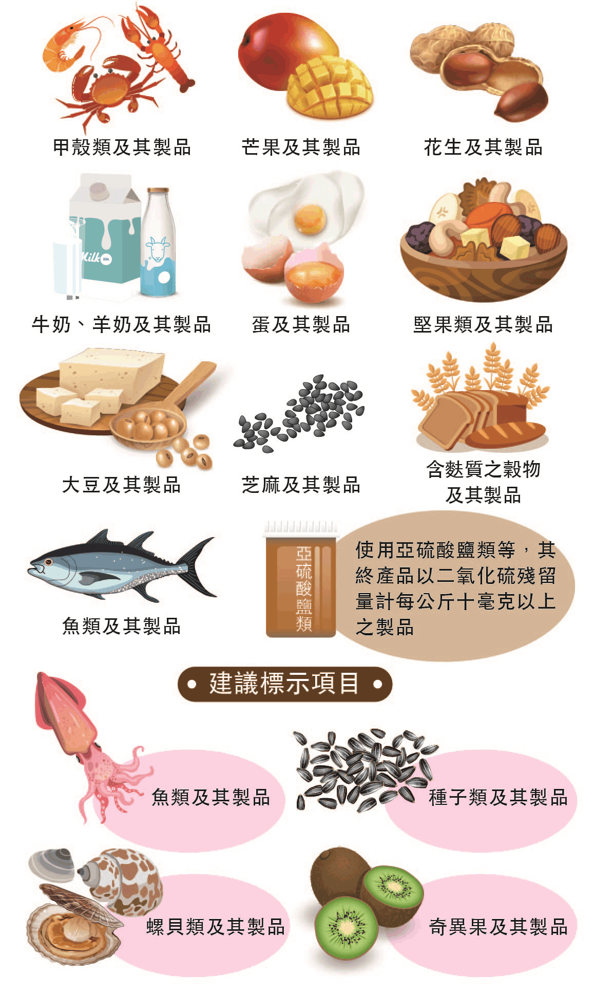 過敏原醒語之標示方式除原有之「本產品含有OO」或「本 產品含有OO,不適合對其過敏體質者食用」,並增列將其 所含致過敏性內容物全部載明於「品名」之方式。