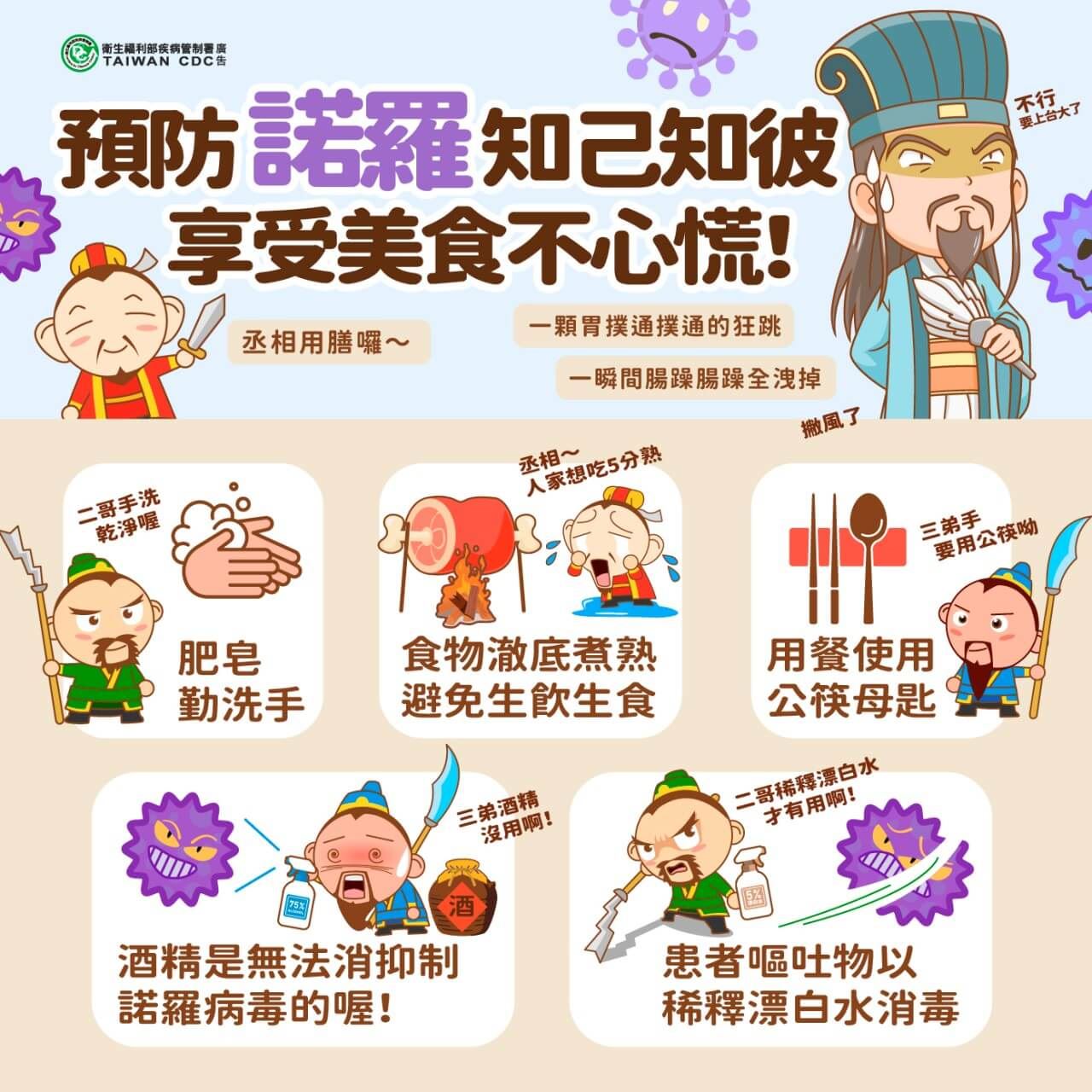 1)每年11月至隔年3月為諾羅病毒流行季節,其傳染力及散播力非常快速、廣泛,常透過糞口途徑或受污染之食品及水源傳染,造成患者出現腹痛、腹瀉、嘔吐及發燒等症狀。