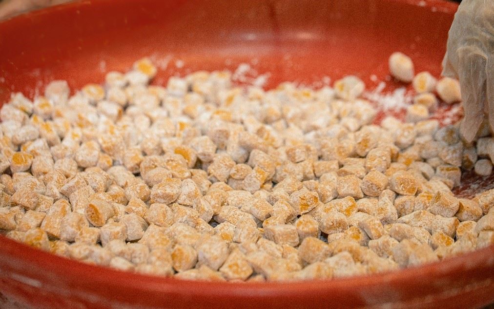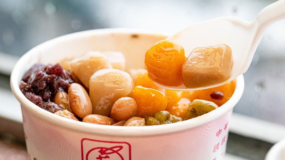 芋圓是由芋頭加澱粉所製成,但各家口感不同,除了芋頭品質外,最大的差異來自於澱粉和芋頭的比例。以當地知名芋圓老店為例,標榜以大量芋頭為主,少量太白粉為輔,沒有其他添加物,即便是合法的修飾澱粉也沒有,才能讓芋圓呈自然芋頭色,且煮熟後一定要在2小時內食用完,否則原本軟Q有嚼勁的芋圓就會變硬;相反的,當芋圓掺的太白粉或其他澱粉占比越重,顏色顯得越透明,若使用修飾澱粉的芋圓,即便放置24小時仍能維持軟Q口感。雖然九份不產芋頭,早期主要是當地居民為貼補家用,擺攤兼賣冰品,後來隨著金礦停止開採,九份逐漸轉變成熱門觀光景點,店家想到把芋泥加入太白粉,變成芋圓來販售,沒想到竟然大受歡迎,從此變成觀光客到瑞芳與九份必吃的傳統小吃。