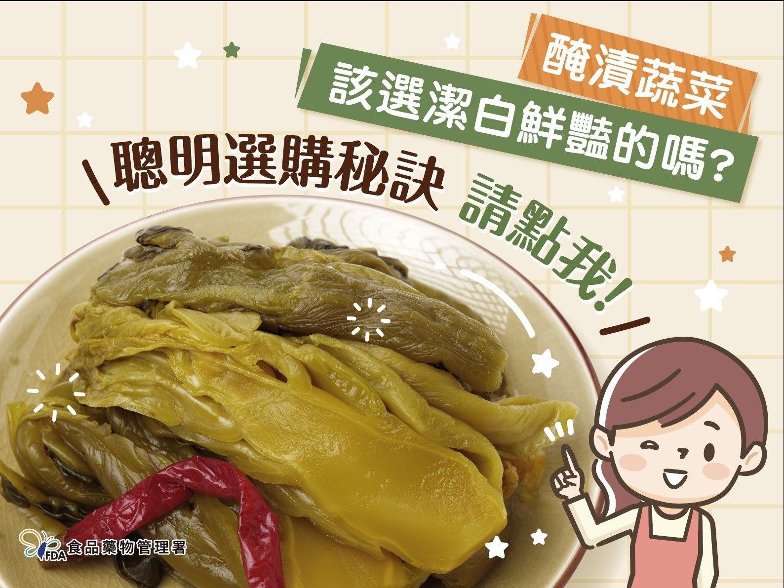 製造一個月以上未使用漂白劑的酸菜,顏色是偏深綠(褐)色,消費者在購買市售的醃漬蔬菜產品時,建議可以先看顏色和包裝,避免購買顏色太過於潔白、鮮豔的食品,建議選擇顏色比較不鮮豔、偏深綠(褐)色的進行購買,除此之外,建議優先選購完整包裝的商品,避免在運輸、貯存的過程中,造成污染及風味的流失,及留意產品是否有明確的標示,以掌握完整的產品訊息。